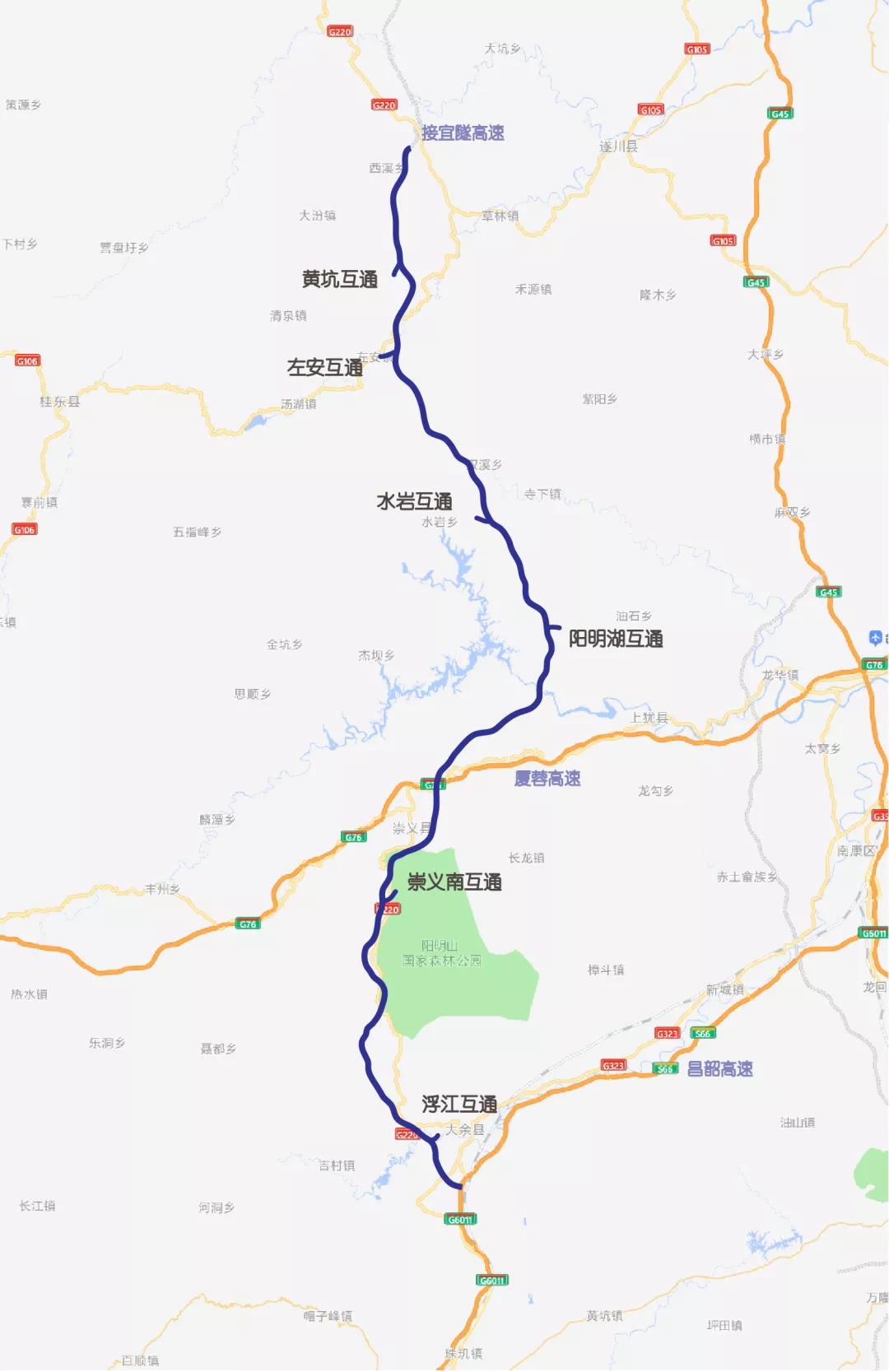 起点位于吉安市遂川县,与在建的宜遂高速相接,一路向南途经赣州市上犹县、崇义县,终点位于赣州市大余县,与南韶高速康大段相连,线路总长约127公里,全线采用双向四车道标准建设。项目桥隧比高达56%,穿越10个环境敏感区,均创江西省高速公路建设史上之最。