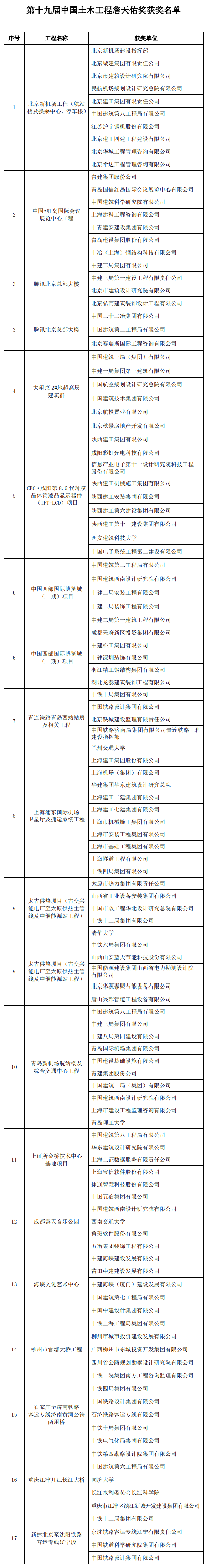 第十九届中国土木工程詹天佑奖经过推荐申报、资格审查、专业组初评、终审会议评审、詹天佑大奖指导委员会审核以及公示等评选程序,共有42项土木工程领域的杰出代表性工程获奖。特此决定对“北京新机场工程(航站楼及换乘中心、停车楼)”等获奖工程及主要承建单位授予中国土木工程詹天佑奖,以资鼓励。