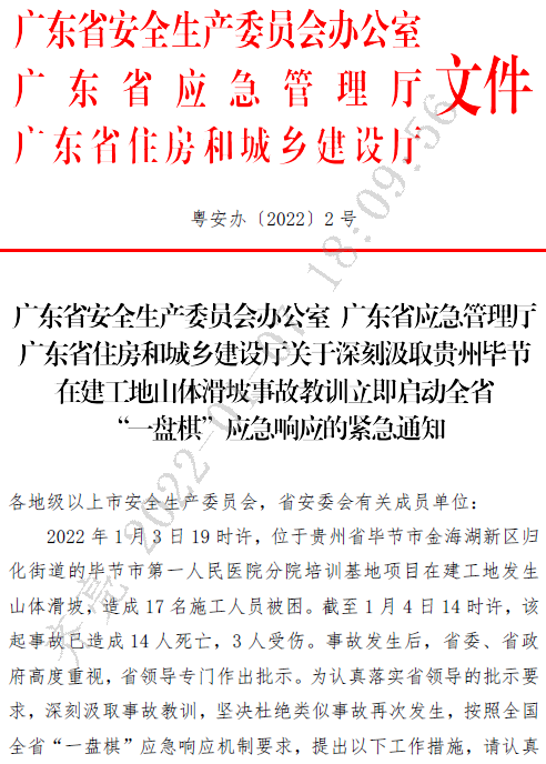 近日,广东省安委办、广东省应急管理厅、广东省住建厅发布了关于深刻汲取贵州毕节在建工地体滑坡事故教训立即启动全省“一盘棋”应急响应的紧急通知。通知明确: