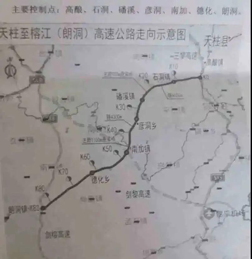 根据勘测单位出示的示意图,起点为天柱县高酿镇附近,在高酿镇设置T型互通连接松从高速,之后经天柱县石洞镇、剑河县磻溪镇、锦屏县彦洞乡、剑河县南加镇、黎平县德化乡,终点位于榕江县朗洞镇,在朗洞镇设置T型互通连接沿榕高速,在南加镇设置枢纽互通连接剑黎高速。全线设置高酿(天柱南)、石洞、磻溪、彦洞、南加、德化、朗洞等7个出入口。预计本项目将于2022年至2023年度开工建设,届时天柱将可以由此前往南部的榕江、荔波,这条高速公路将为天柱县以及沿线乡镇提供南下广西北部湾的新通道。