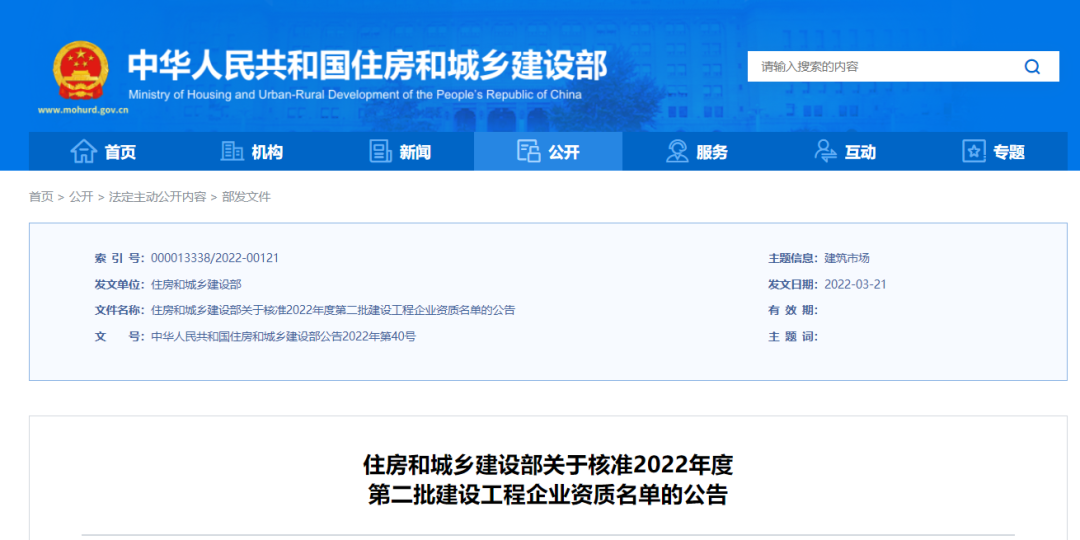 3月23日,住建部发布《关于核准2022年度第二批建设工程企业资质名单的公告》,其中22家建筑业企业获特级资质: