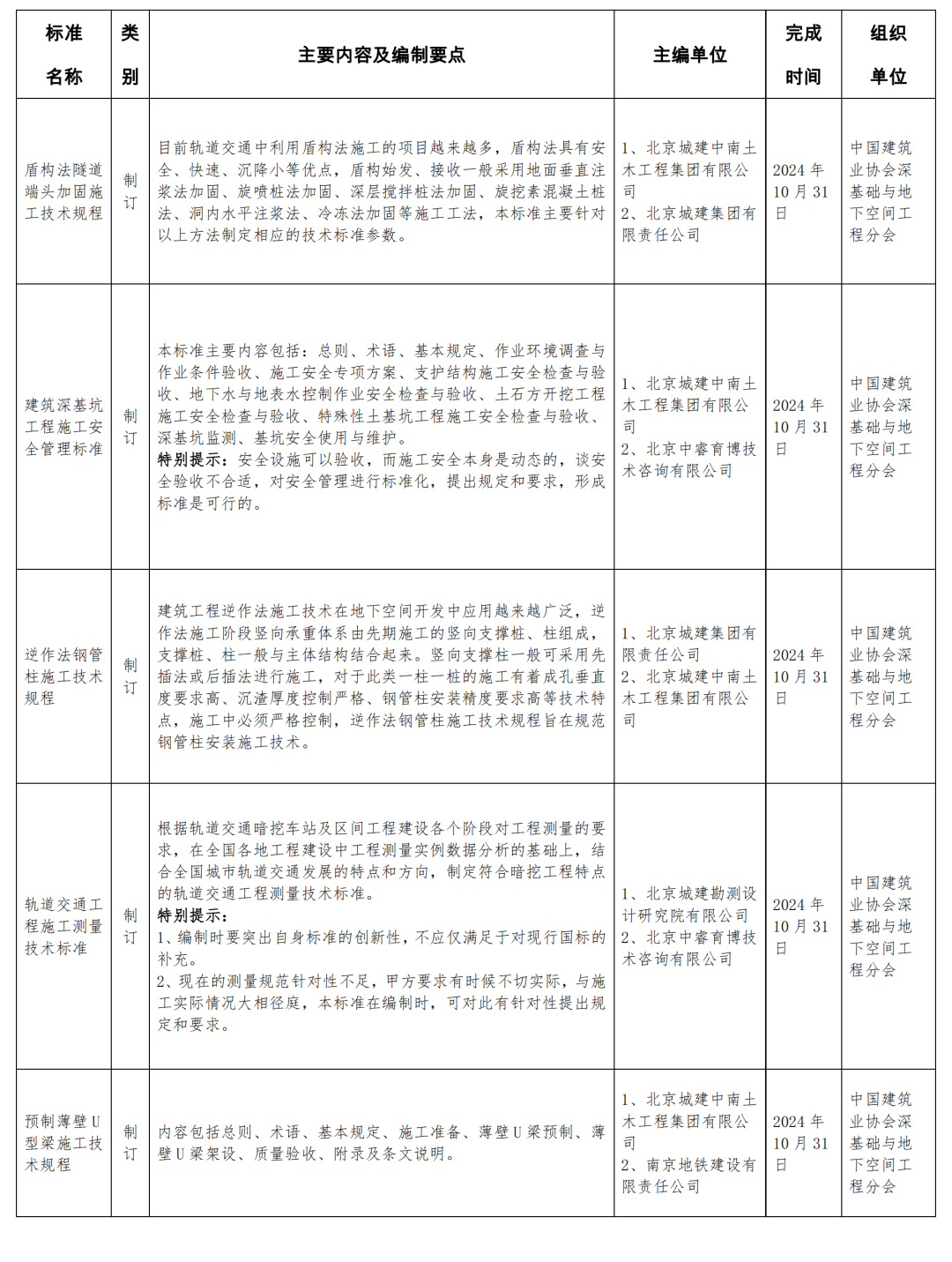 为贯彻落实《国务院关于印发深化标准化工作改革方案的通知》和《住房城乡建设部办公厅关于培育和发展工程建设团体标准的意见》的文件精神,由北京城建集团有限公司、北京城建中南土木工程集团有限公司、北京城建勘察设计研究院有限公司、南京地铁建设有限公司、北京中睿育博技术咨询有限公司主编,北京金山基础工程咨询公司组织、编写、协调的《盾构法隧道端头加固施工技术规程》《建筑深基坑工程施工安全管理标准》《逆作法钢管柱施工技术规程》《轨道交通工程施工测量技术标准》《预制薄壁U型梁施工技术规程》5项标准已正式立项,相关编制工作也已启动。
