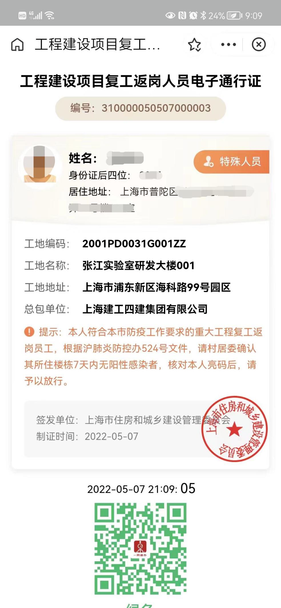 5月7日,上海市住房城乡建设管理委为张江实验室研发大楼项目发出了全市首张工程建设项目复工返岗人员电子通行证(简称“复工证”)。这张集成了身份证明、48小时核酸检测报告等内容的电子“复工证”正在为上海市重大项目有序复工按下“快进键”。