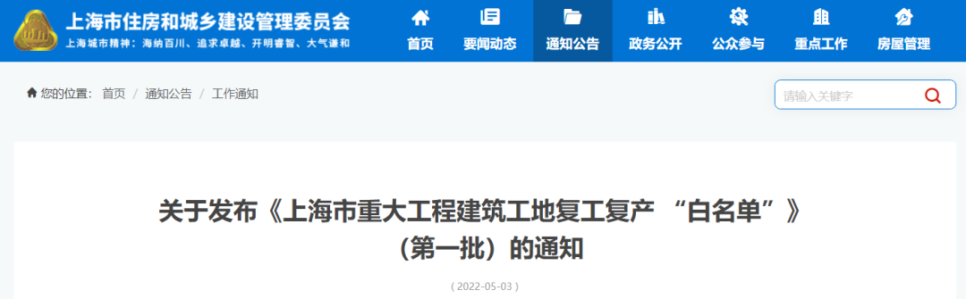 根据《上海市重大工程建筑工地复工复产疫情防控指引(1.0版)》(沪肺炎防控办〔2022〕524号)文件要求,经研究,现发布《上海市重大工程建筑工地复工复产“白名单”》(第一批)。