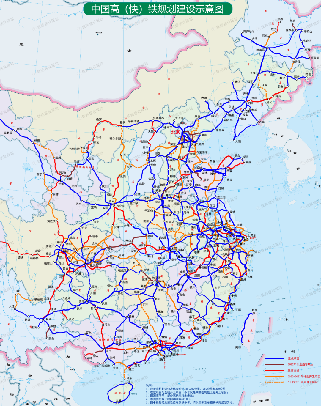 川藏铁路雅安至林芝段、沈阳至长白山、铁力至伊春、集宁至大同至原平、重庆至昆明、成都至黄胜关、兰州至合作、贵阳至南宁、重庆至黔江、成都至自贡至宜宾、铜川至延安、西安至十堰、中川机场至武威、濮阳至济南、庄寨至兰考、宜昌至兴山、成达万、合肥至泗县、南昌至景德镇至黄山、池州至黄山、宣城至绩溪、上海至苏州至湖州、江苏南沿江、沪通铁路太仓至四团、义乌至温州、金华至建德、盘州至兴义、防城港至东兴、龙岩至武平、梅州至龙川、广州至湛江、南宁至玉林至岑溪、珠三角机场至江门至珠海段、崇左至凭祥、广州至汕尾至汕头、福州至厦门、淮北至宿州至蚌埠、潍坊至烟台、莱西至荣成、衡水至沧州至黄骅、巢湖至马鞍山、建德至衢州、温岭至玉环、松阳至丽水、南充至巴中、荆门至荆州、包头至银川等。