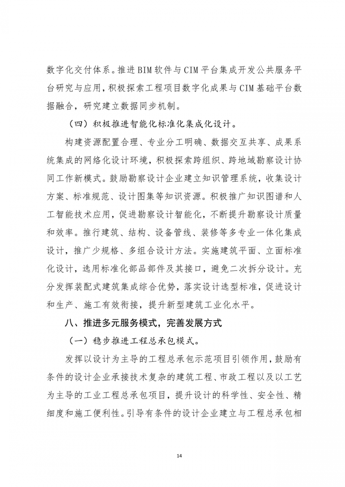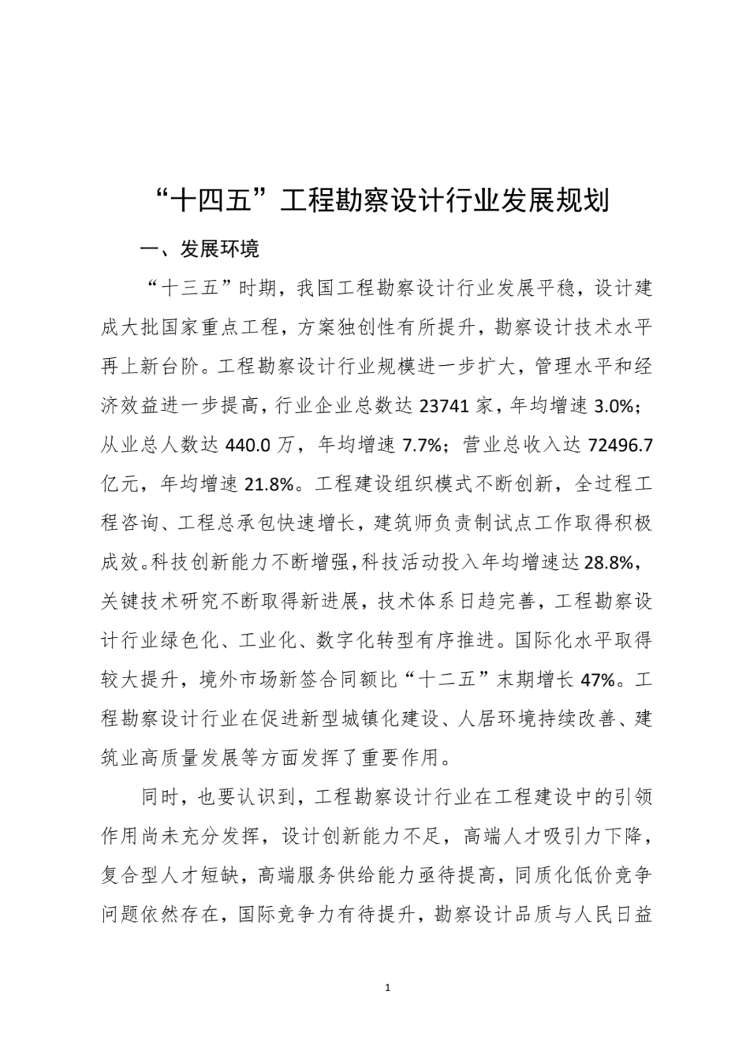 近日,住房和城乡建设部印发《“十四五”工程勘察设计行业发展规划》,明确“十四五”时期行业发展目标:工程勘察设计行业稳步发展,规模持续扩大,效益显著提高,勘察设计在工程建设中的引领作用进一步凸显;勘察设计相关法规制度不断完善,市场环境进一步优化,诚信体系初步建立,勘察设计质量得到充分保障;工程勘察设计行业绿色化、工业化、数字化转型全面提速,技术管理创新和综合服务能力不断增强,标准化、集成化水平进一步提升,持续助力建筑业高质量发展。