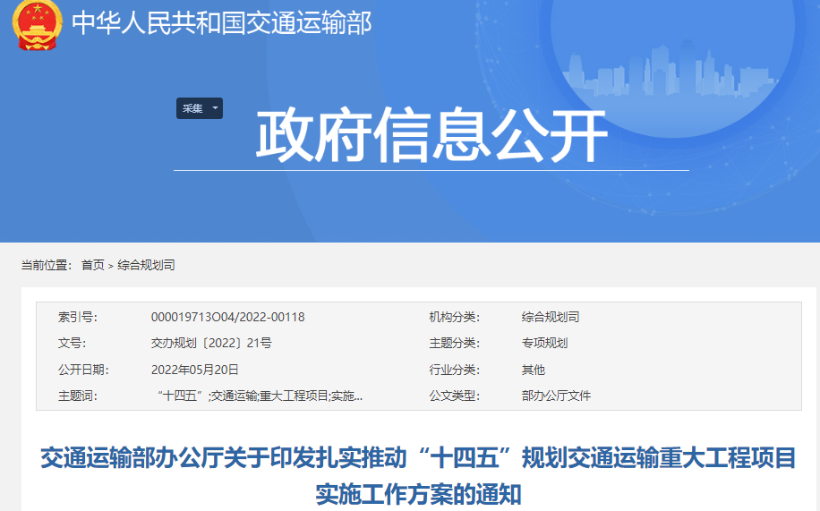 为扎实推进“十四五”交通运输重大工程,结合“十四五”规划和当前在建项目,筛选出一批投资规模大、社会影响大、技术难度大的项目,作为第一批加快建设交通强国“十四五”重点项目,予以重点推进。
