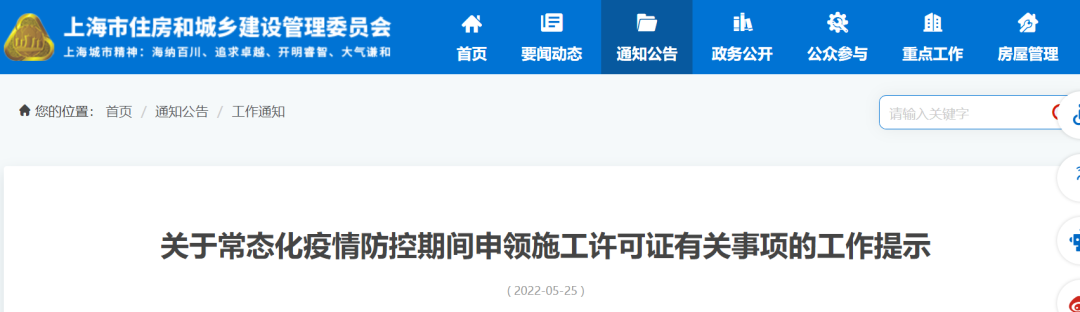 同时,为了统筹推进疫情防控和复工复产的总体部署,上海市住建委发布《关于常态化疫情防控期间申领施工许可证有关事项的工作提示》。