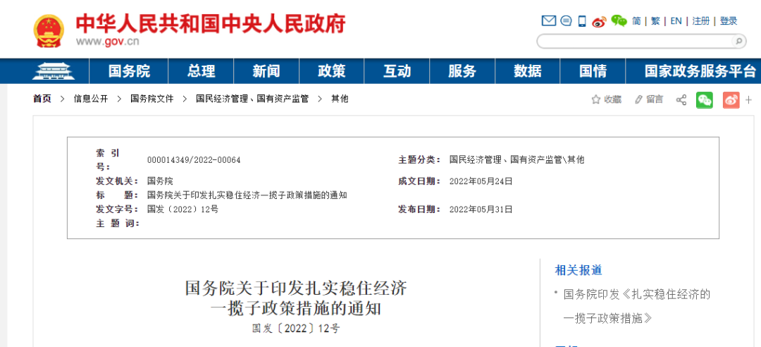 5月31日,国务院发布《关于印发扎实稳住经济一揽子政策措施的通知》,要求各地区各部门要按照通知提出的6方面33项具体政策措施认真贯彻执行。