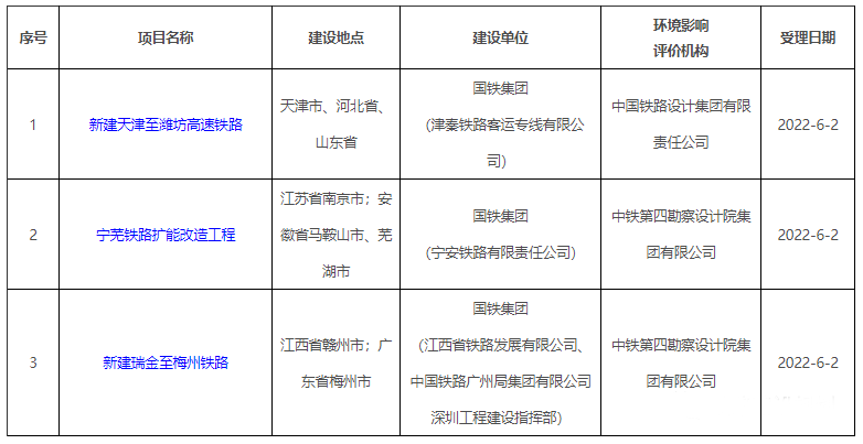 6月6日,生态环境部发布了《关于2022年5月30日—2022年6月2日建设项目环境影响评价文件受理情况的公示》,正式受理新建天津至潍坊高速铁路、宁芜铁路扩能改造工程和新建瑞金至梅州铁路的环境影响报告书。公示期为2022年6月6日—2022年6月17日(10个工作日)。