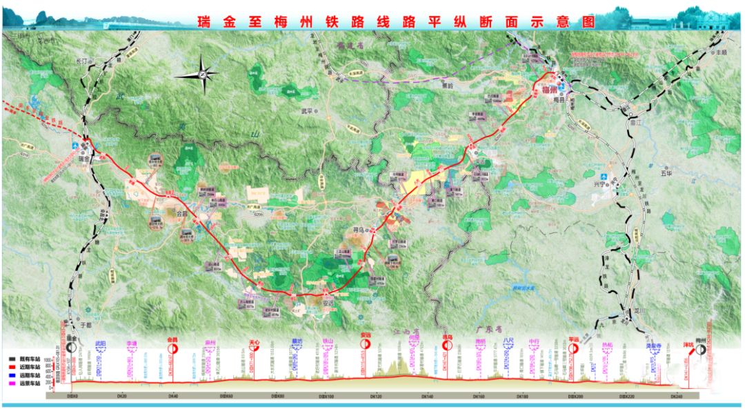 新建瑞金至梅州铁路位于江西省南部、广东省东北部,起自既有赣龙铁路瑞金站,经江西省赣州市会昌县、安远县、寻乌县,广东省梅州市平远县、梅县区、梅江区至既有漳龙铁路梅州站,新建正线长度约240.415km。速度目标值160km/h,单线Ⅰ级铁路,客货共线,采用电力牵引。