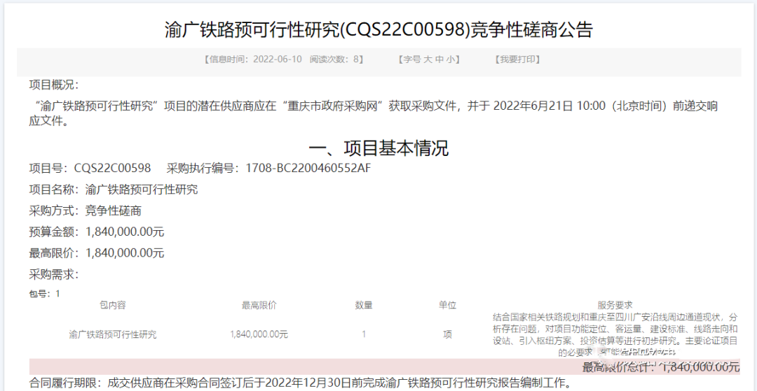 合同履行期限:成交供应商在采购合同签订后于2022年12月30日前完成渝广铁路预可行性研究报告编制工作。