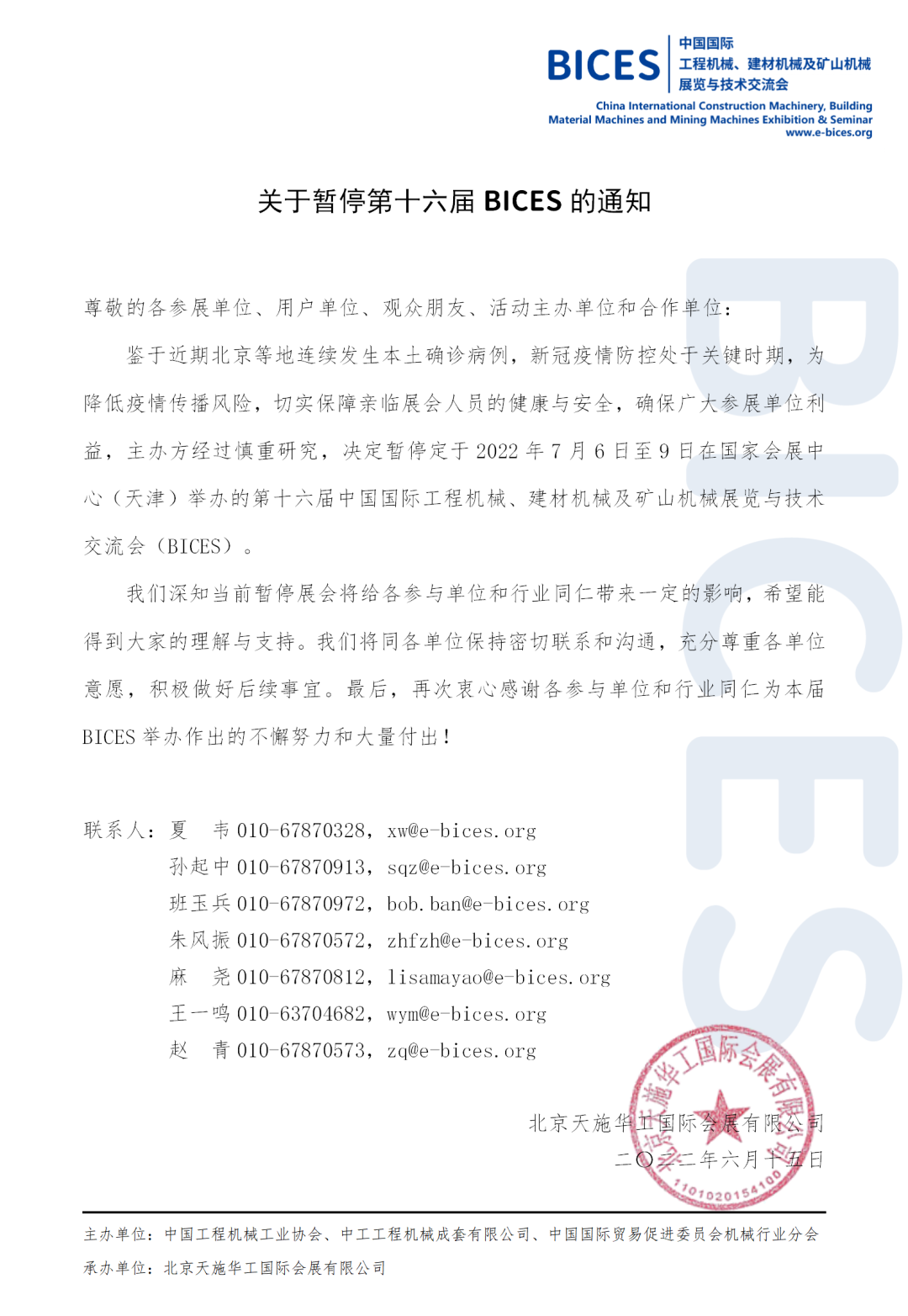 关于暂停第十六届BICES的通知