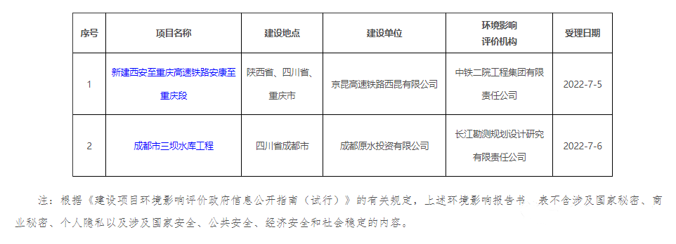 铁路建设规划消息:7月11日,生态环境部发布了《关于2022年7月4日—2022年7月8日建设项目环境影响评价文件受理情况的公示》,正式受理新建西安至重庆高速铁路安康至重庆段环境影响报告书。