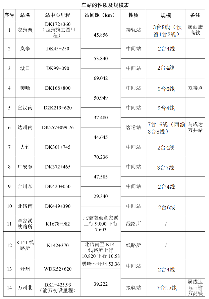 全线新建车站10座,分别为岚皋站、城口站、樊哙站、宣汉南站、达州南站、大竹站、广安东站、合川东站、北碚南站和开州站,引入既有或在建车站3座,分别为安康西站(在建)、重庆西站(既有)和万州北站(既有)。