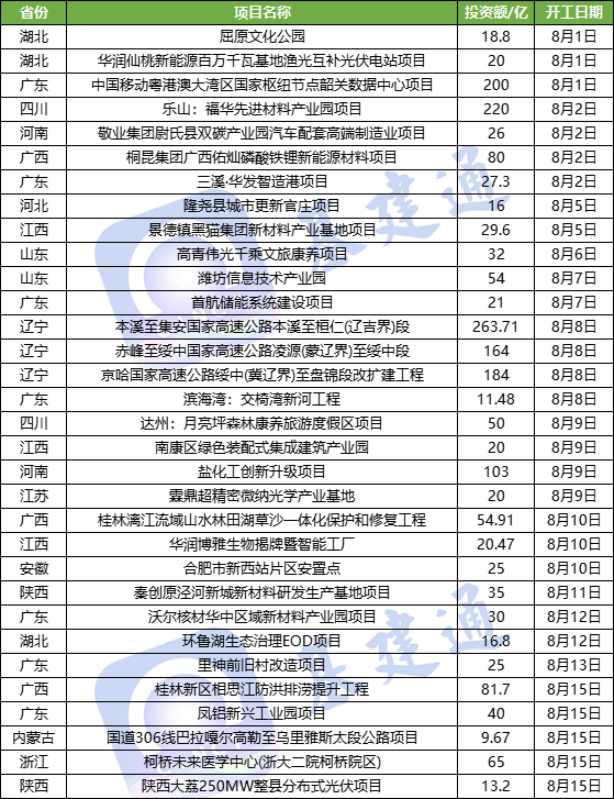 据统计:8月1日-8月15日,全国重大开工项目约 32个,共计总投资约 1978 亿元,包括:公路、水利、房建、城市改造、产业园等项目,具体如下: