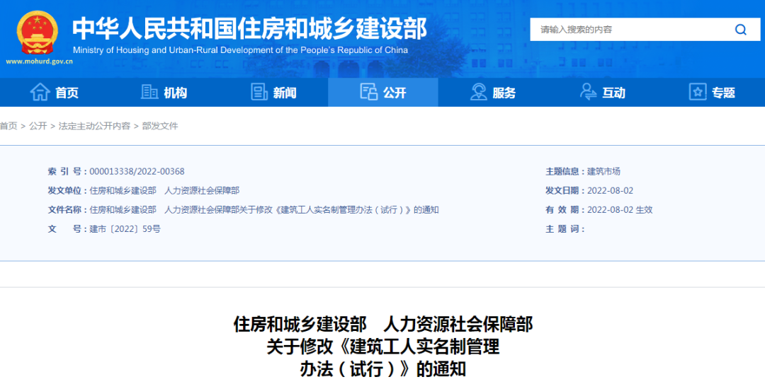 各省、自治区住房和城乡建设厅、人力资源社会保障厅,直辖市住房和城乡建设(管)委、人力资源社会保障局,新疆生产建设兵团住房和城乡建设局、人力资源社会保障局:为了进一步促进就业,保障建筑工人合法权益,住房和城乡建设部、人力资源社会保障部决定修改《建筑工人实名制管理办法(试行)》(建市〔2019〕18号)部分条款,现通知如下:一、将第八条修改为:“全面实行建筑工人实名制管理制度。建筑企业应与招用的建筑工人依法签订劳动合同,对不符合建立劳动关系情形的,应依法订立用工书面协议。建筑企业应对建筑工人进行基本安全培训,并在相关建筑工人实名制管理平台上登记,方可允许其进入施工现场从事与建筑作业相关的活动。”二、将第十条、第十一条、第十二条和第十四条中的“劳动合同”统一修改为“劳动合同或用工书面协议”。本通知自公布之日起施行。