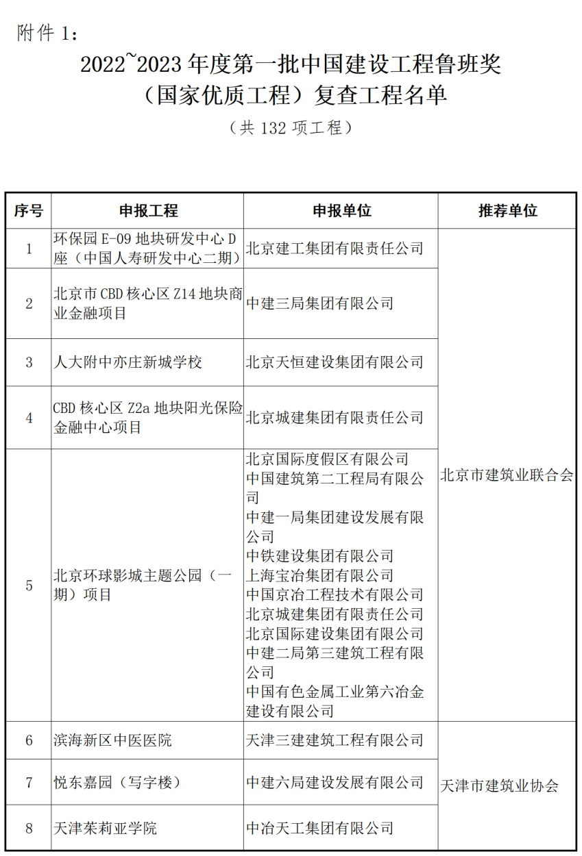 中国建筑业协会近日发布关于开展2022~2023年度第一批中国建设工程鲁班奖(国家优质工程)复查工作的通知。共有132项工程符合要求,列入复查计划。