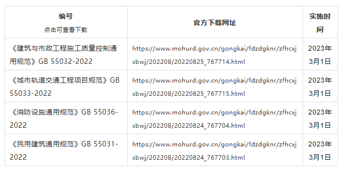 近日,住建部官网发布《建筑与市政工程施工质量控制通用规范》、《城市轨道交通工程项目规范》、《消防设施通用规范》、《民用建筑通用规范》等4条国家标准。全部自2023年3月1日起实施。本规范为强制性工程建设规范,全部条文必须严格执行。同时废止了一大批现行工程建设标准相关强制性条文。