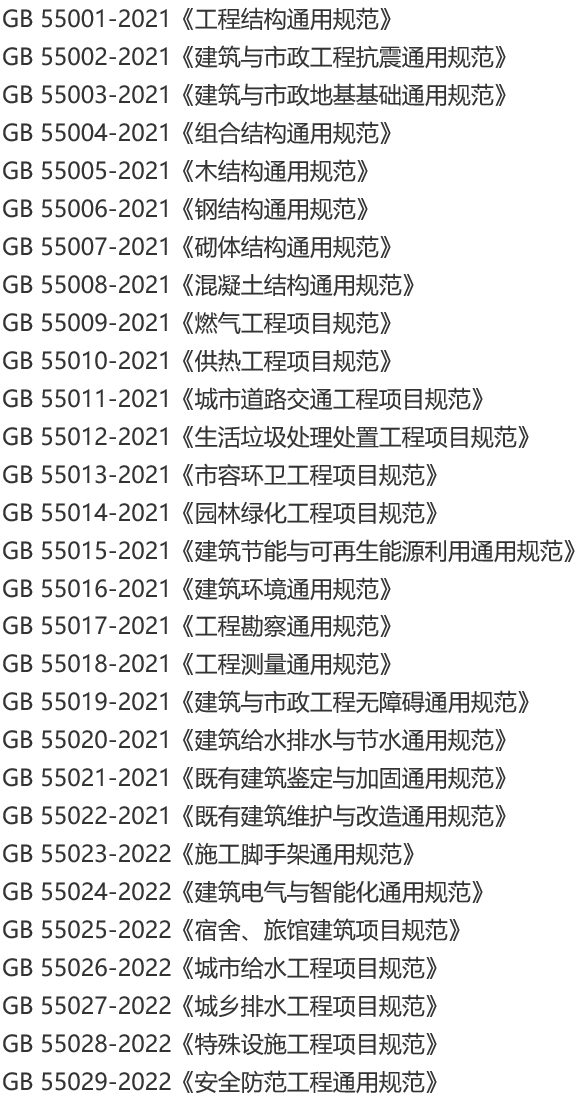 从2021年截至目前,除了上述几本,住建部一共发布了29本通用规范(GB55001~55029),规范均为强制性工程建设规范,全部条文必须严格执行,现行工程建设标准相关强制性条文同时废止。