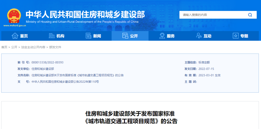 现批准《城市轨道交通工程项目规范》为国家标准,编号为GB 55033-2022,自2023年3月1日起实施。本规范为强制性工程建设规范,全部条文必须严格执行。现行工程建设标准中有关规定与本规范不一致的,以本规范的规定为准。同时废止现行国家标准《城市轨道交通技术规范》GB 50490-2009和下列现行工程建设标准相关强制性条文: