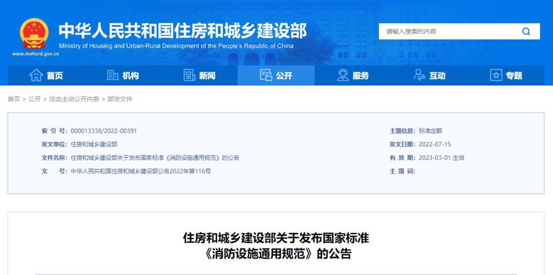 现批准《消防设施通用规范》为国家标准,编号为GB 55036-2022,自2023年3月1日起实施。本规范为强制性工程建设规范,全部条文必须严格执行。现行工程建设标准中有关规定与本规范不一致的,以本规范的规定为准。国家标准《卤代烷1211灭火系统设计规范》GBJ 110-1987、《卤代烷1301灭火系统设计规范》GB 50163-1992、《二氧化碳灭火系统设计规范》GB 50193-1993转为推荐性国家标准,编号分别为:GB/T 50110-1987、GB/T 50163-1992、GB/T 50193-1993。同时废止下列工程建设标准相关强制性条文:
