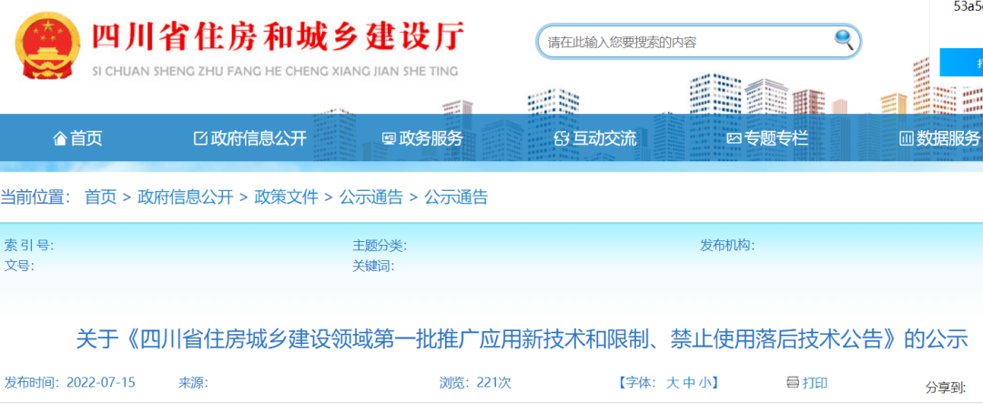 根据《四川省住房城乡建设领域新技术推广应用管理办法(试行)》(川建行规〔2022〕4号)相关要求,按规定完成公开征集、专家评审等程序,拟将以下技术列入《四川省住房城乡建设领域推广应用新技术和限制、禁止使用落后技术公告(第一批)》,现予以公示,公示期5个工作日(2022年7月15日至7月21日)。公示期内,任何单位和个人如对公示内容有异议,可通过电话、书面方式向勘察设计与科学技术处联系。