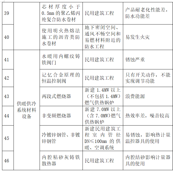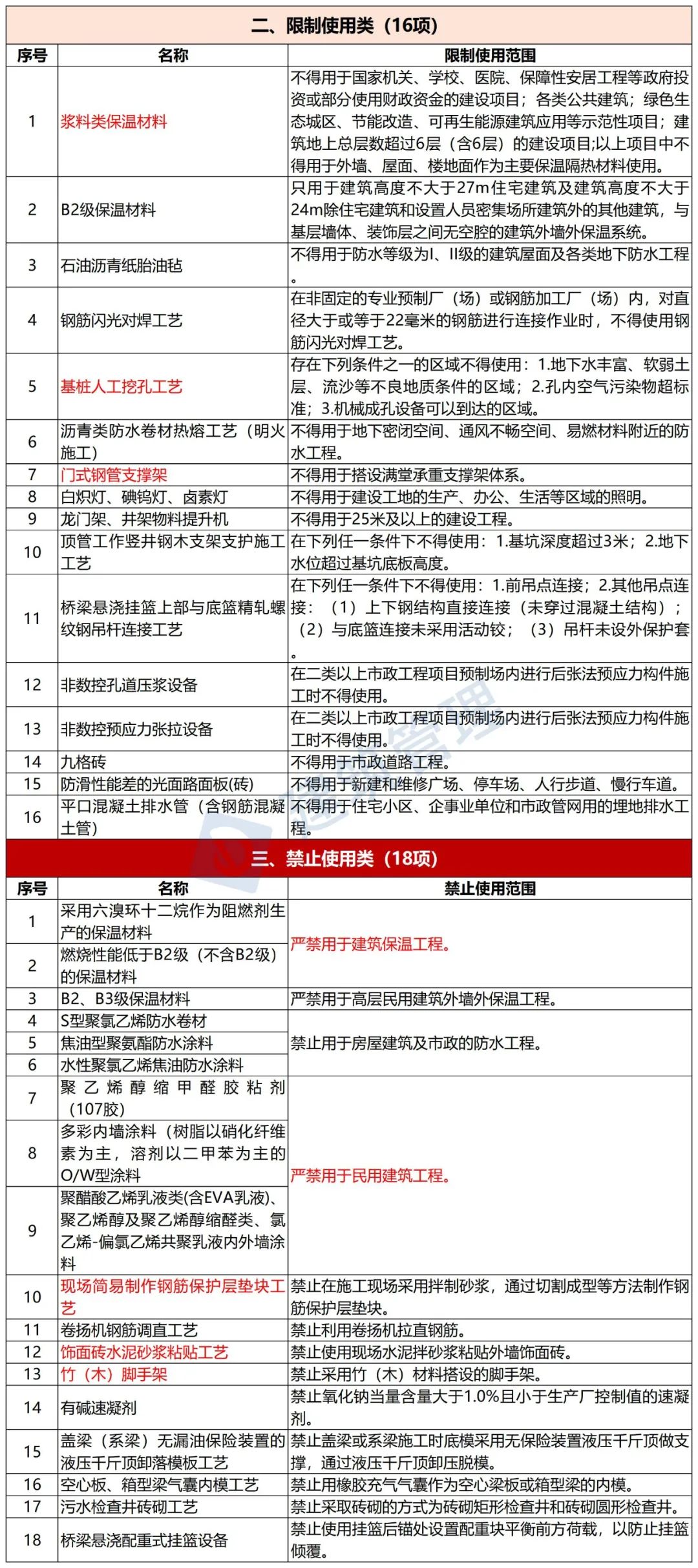 公告指出,房屋建筑和市政基础设施工程从业单位要在2022年09月15日后,全面停止在新开工项目中使用本《目录》所列禁止的施工工艺、设备和材料;2022年06月15日后,新开工项目不得在限制条件和范围内使用本《目录》所列限制类施工工艺、设备和材料。