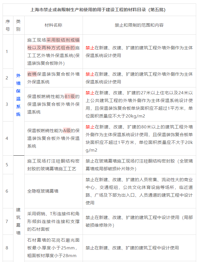 2020年10月13日,上海市住房和城乡建设管理委员会公布了《上海市禁止或者限制生产和使用的用于建设工程的材料目录(第五批)》。要求2020年11月1日前未通过施工图设计文件审查备案的项目以及2020年12月31日前尚未开始墙体节能工程施工的项目严格执行。