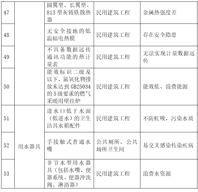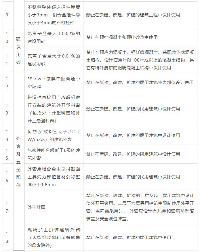 一、2018年版目录修订首次增加了5类禁止使用的建筑材料及设备,包括:萘系减水剂,施工现场非密闭拌制的保温砂浆,聚氯乙烯类密封条、隔热条、暖边间隔条,不满足《建筑类涂料与胶粘剂挥发性有机化合物含量限值标准》(DB11/3005-2017)的涂料和胶粘剂, 能效标识二级及以下、氮氧化物排放未达到《燃气采暖热水炉》(GB 25034-2010)5级要求的燃气采暖用壁挂炉。原2014年版目录中,HPB235热轧光圆钢筋等12种禁限类产品因标准已失效等原因,不再列入2018年版目录。2018年版目录共计列入13类77种禁止使用产品。