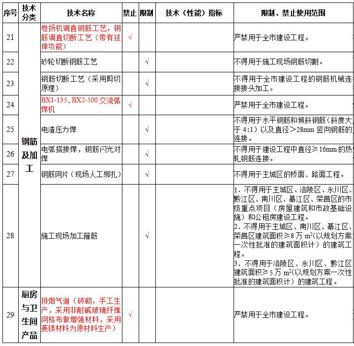 为适应行业高质量发展需要,进一步推动新技术工程应用,促进行业技术创新和转型升级发展,提高行业建设技术、工程质量和安全生产水平,根据《建设领域推广应用新技术管理规定》(建设部令第109号)和《重庆市建设领域推广应用新技术管理办法》(渝建发〔2010〕65号),编制形成了《重庆市建设领域禁止、限制使用落后技术通告(2019年版)》(以下简称《技术通告》),现予以发布,并将有关要求通知如下: