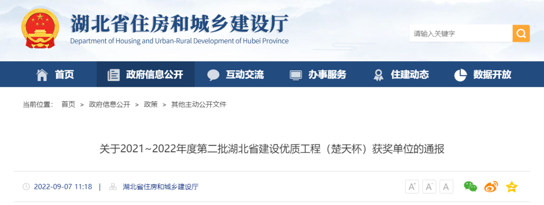 9月7日,湖北省住建厅发布《关于2021~2022年度第二批湖北省建设优质工程(楚天杯)获奖单位的通报》,共109项工程获奖。