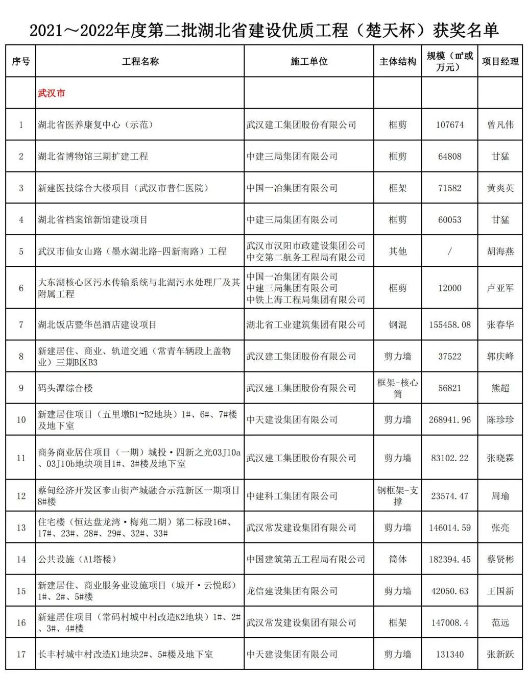 2021~2022年度第二批湖北省建设优质工程(楚天杯)获奖名单