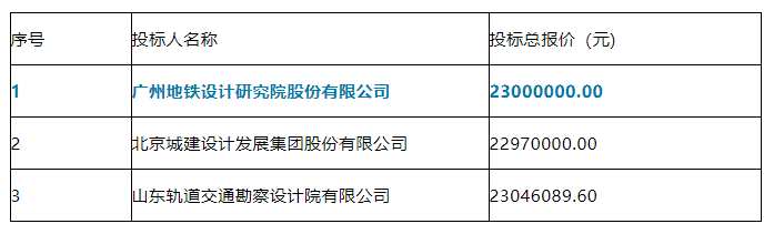 3、广州地铁设计研究院股份有限公司,投标总报价(元):22492355.00
