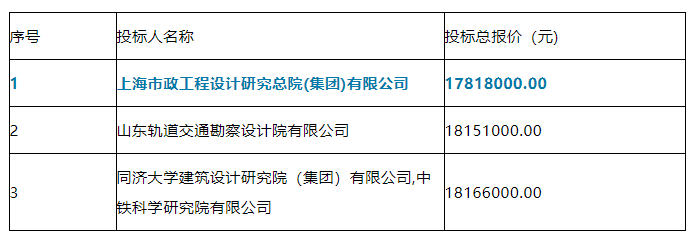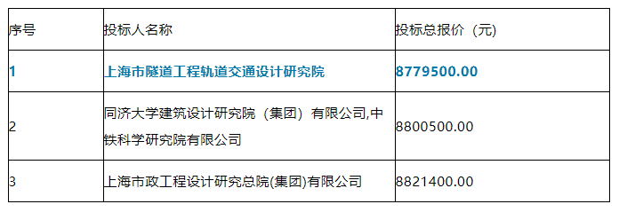 2、上海市隧道工程轨道交通设计研究院,投标总报价(元):40768000.00