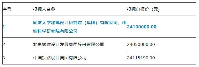 1、中国铁路设计集团有限公司、中国市政工程华北设计研究总院有限公司,投标总报价(元):19119451.00