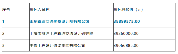 1、山东轨道交通勘察设计院有限公司,投标总报价(元):22347864.00