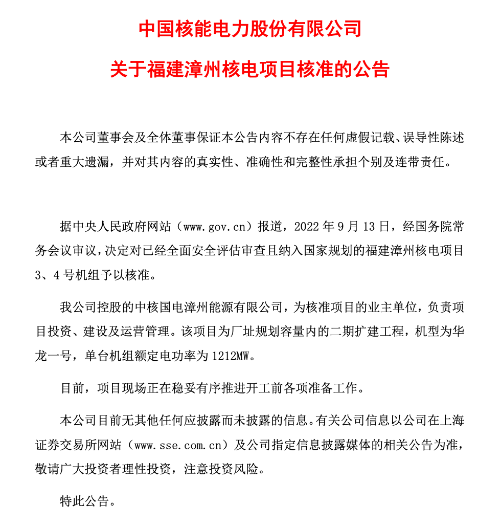 中国核电14日晚间公告对公司核电项目被核准进行了确认。公司控股的中核国电漳州能源有限公司,为核准项目的业主单位,负责项目投资、建设及运营管理。该项目为厂址规划容量内的二期扩建工程,机型为华龙一号,单台机组额定电功率为1212MW。目前,项目现场正在稳妥有序推进开工前各项准备工作。