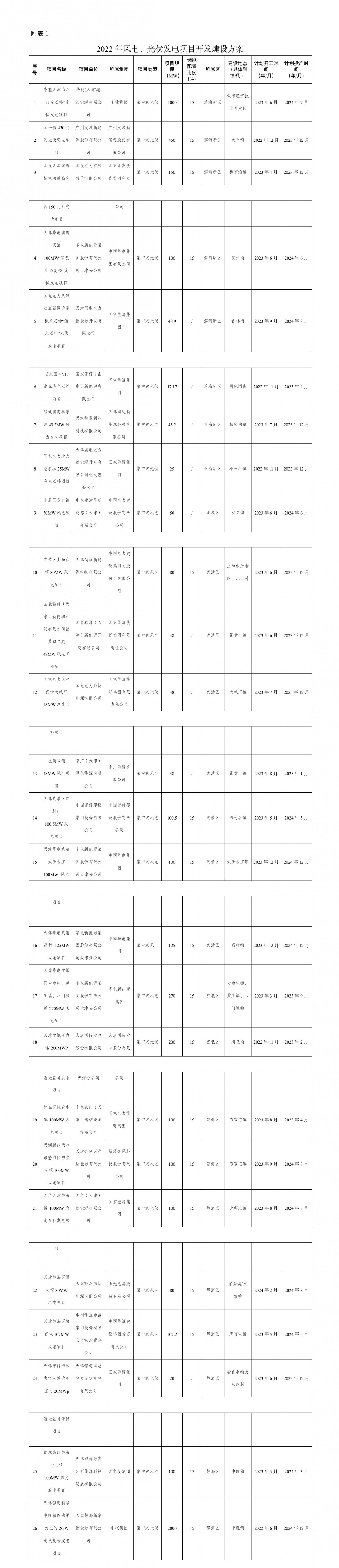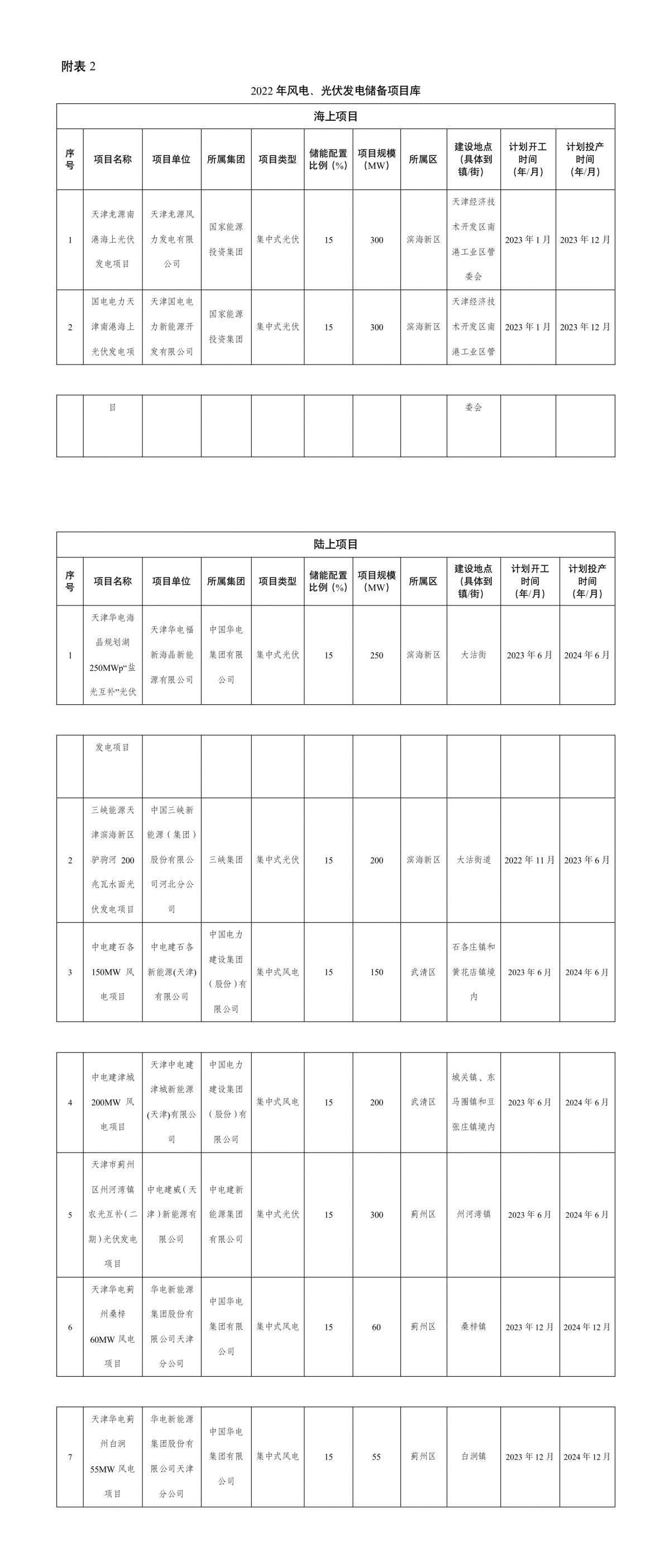 根据天津市发改委《关于天津市2022年风电、光伏发电项目开发建设方案的公示》,2022年天津市风电、光伏发电项目开发建设方案中项目共计46个,项目规模总计7340.27MW,项目类型为集中式风电和集中式光伏。其中,风电项目30个,规模总计2621.2MW,光伏项目16个,规模总计4719.07MW。另有9个项目列入储备项目名单。