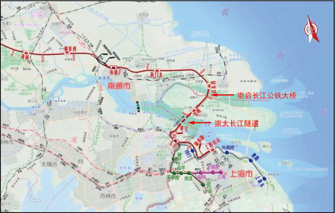 崇启长江公铁大桥在启东新三和港下游约1.5公里附近跨越长江北支,为南北走向,距离下游的崇启长江公路大桥约16公里。