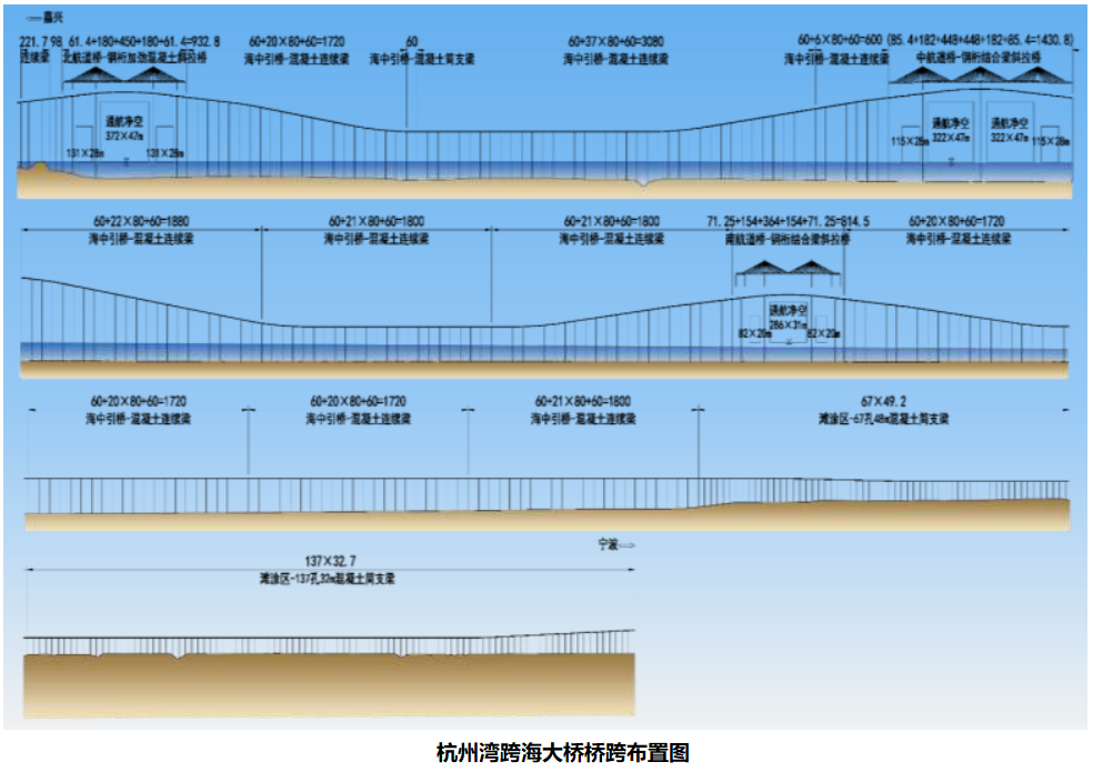 大桥全长29.27公里,其中跨海段桥总长29.06公里,北、中、南3座航道桥分别为主跨450米、2×448米和364米的斜拉桥。