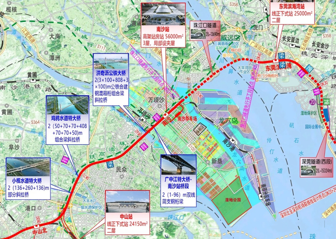 深圳至江门铁路洪奇沥水道特大桥主桥位于既有洪奇沥公路桥下游3.5公里处,北距南沙港铁路洪奇沥水道桥约9公里,是深江铁路与广中珠澳高铁、中(山)-南(沙)城市道路合并建设的四线并行公铁合建特大桥。