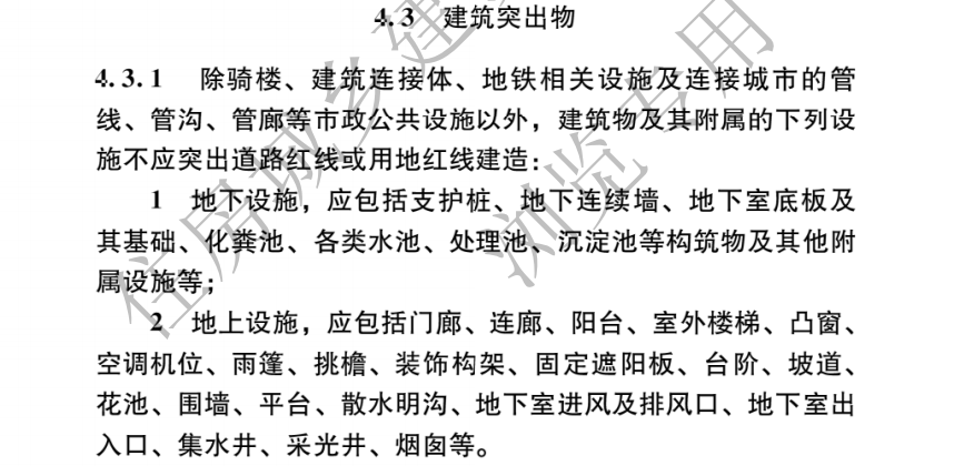 4.3.1除骑楼、 建筑连接体、地铁相关设施及连接城市的管线、管沟、管廊等市政公共设施以外,建筑物及其附属的下列设施不应突出道路红线或用地红线建造: