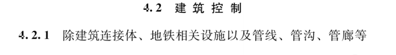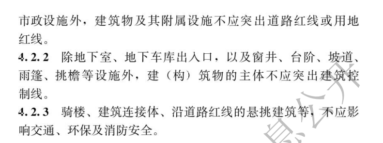 4.2.1 除建筑连接体、地铁相关设施以及管线、管沟、管廊等市政设施外,建筑物及其附属设施不应突出道路红线或用地红线。