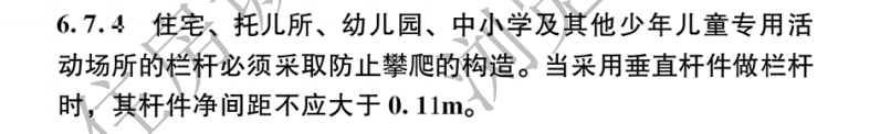 6.7.4 住宅、托儿所、幼儿园、中小学及其他少年儿童专用活动场所的栏杆必须采取防止攀爬的构造。当采用垂直杆件做栏杆时,其杆件净间距不应大于0. 11m。