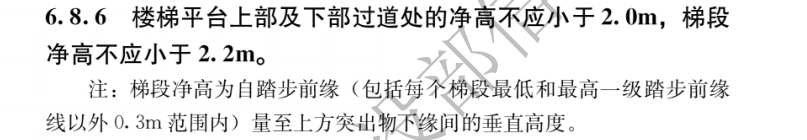 6.8.6 楼梯平台上部及下部过道处的净高不应小于2.0m,梯段净高不应小于2. 2m。