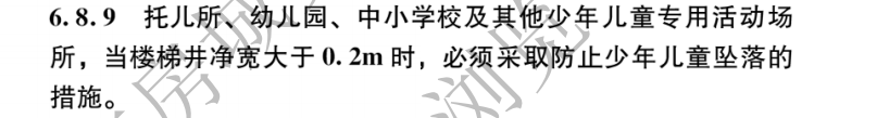 6.8.9 托儿所、幼儿园、中小学校及其他少年儿童专用活动场所,当楼梯井净宽大于0.2m时,必须采取防止少年儿童坠落的措施。
