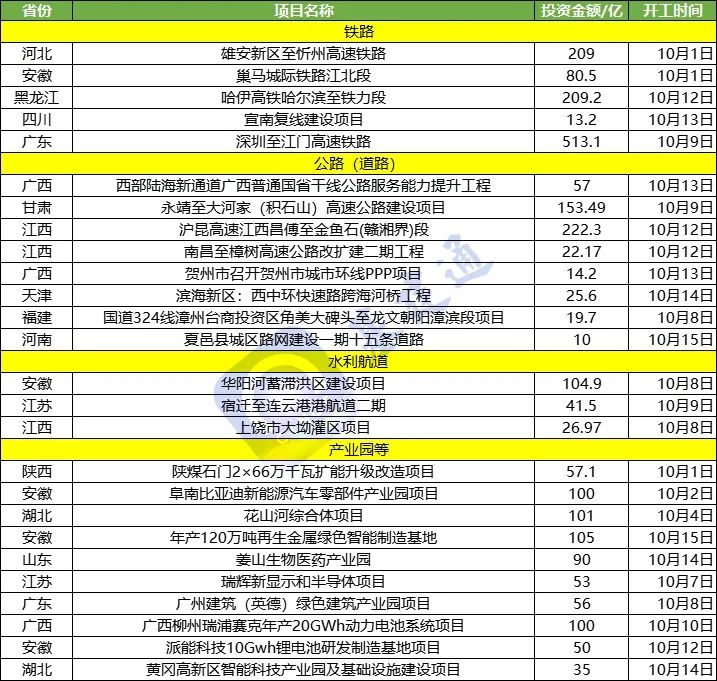 据统计:10月1日-10月15日,全国重大项目开工 26 项,总投资约 2470 亿元。其中,铁路 5 条,共计总投资约 1025亿元;公路 7 个,总投资约 514 亿元。具体详情如下: