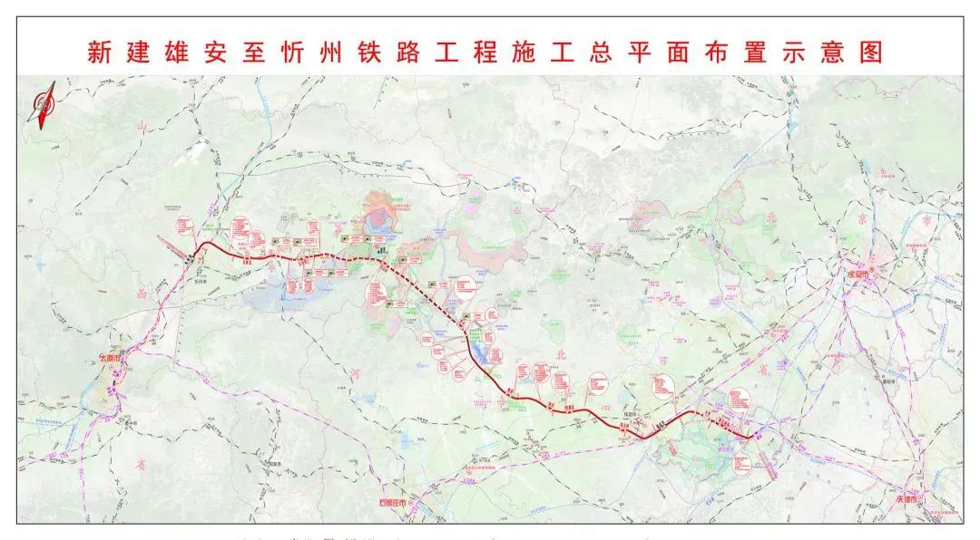 项目概况:线路东起京雄城际铁路雄安站,向西经河北省雄安新区、保定市,至山西省忻州市,接入大同至西安高铁忻州西站。正线全长342公里,设计时速350公里,建设工期4.5年。雄忻高铁全线设雄安站、雄安城际站、小里站、保定东站、保定南站、唐县站、望都北站、曲阳站、阜平站、五台山站、五台县站、定襄北站、忻州西站等13座车站,其中雄安城际站等9座车站为新建车站