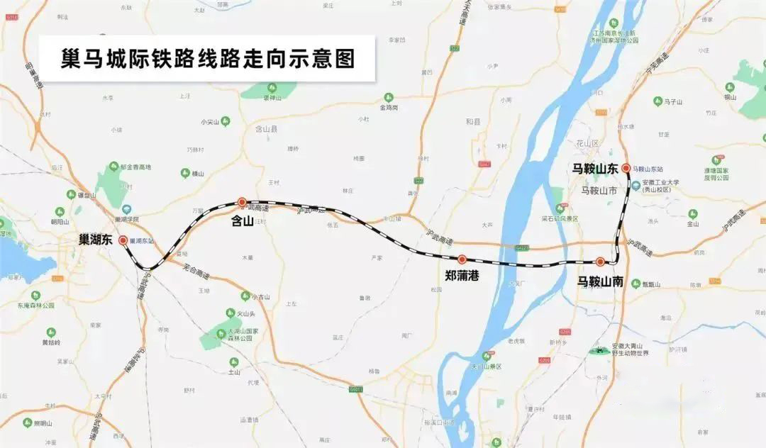 项目概况:巢马城际铁路起于商合杭铁路巢湖东站,向东经含山县、和县、郑蒲港新区、当涂县、经开区、雨山区、花山区后引入马鞍山东站。巢马城际铁路正线全长61公里,其中,江北段新建正线约47公里,设计时速350公里,建设工期4年。全线设巢湖东、含山、郑蒲港、马鞍山南、马鞍山东共计5座车站。